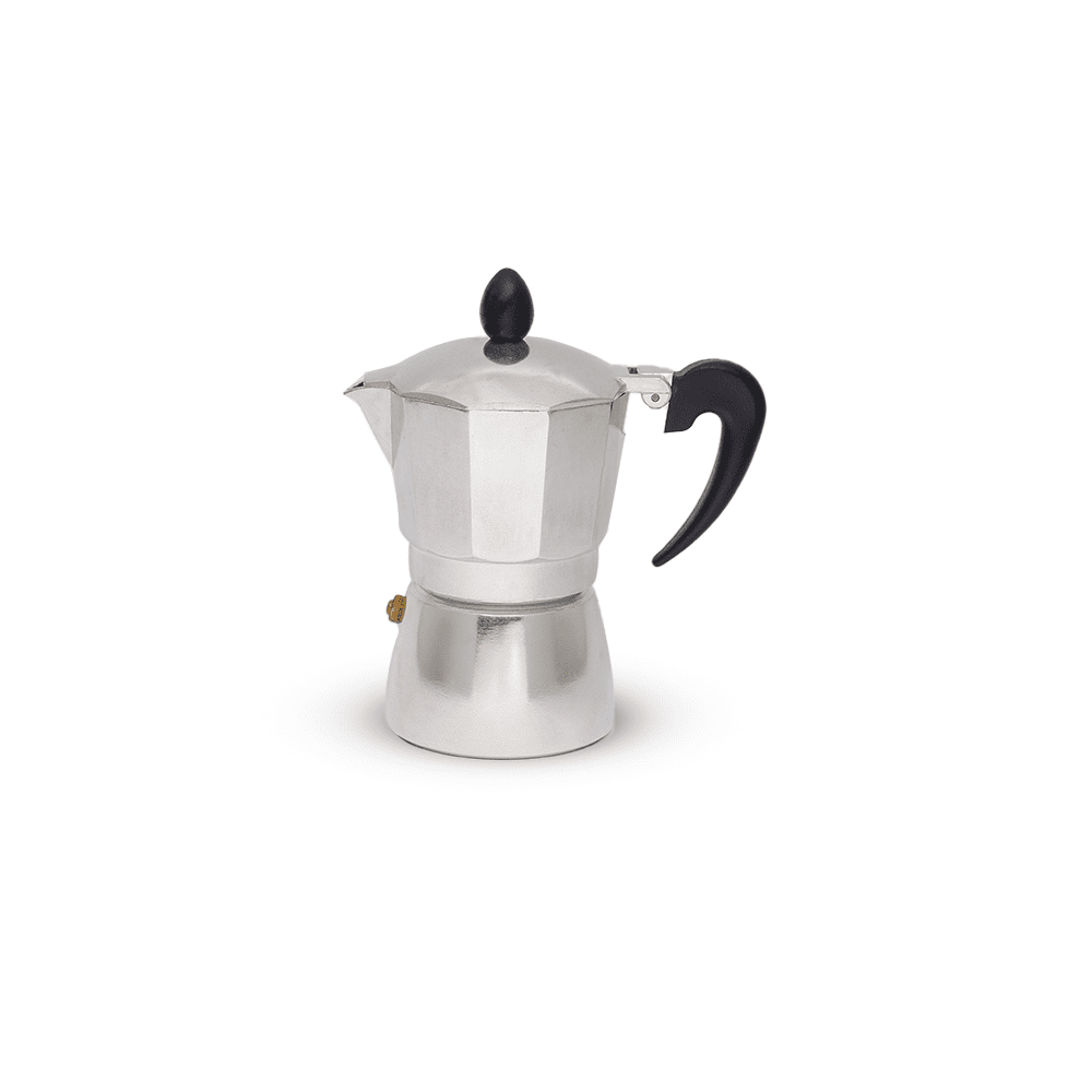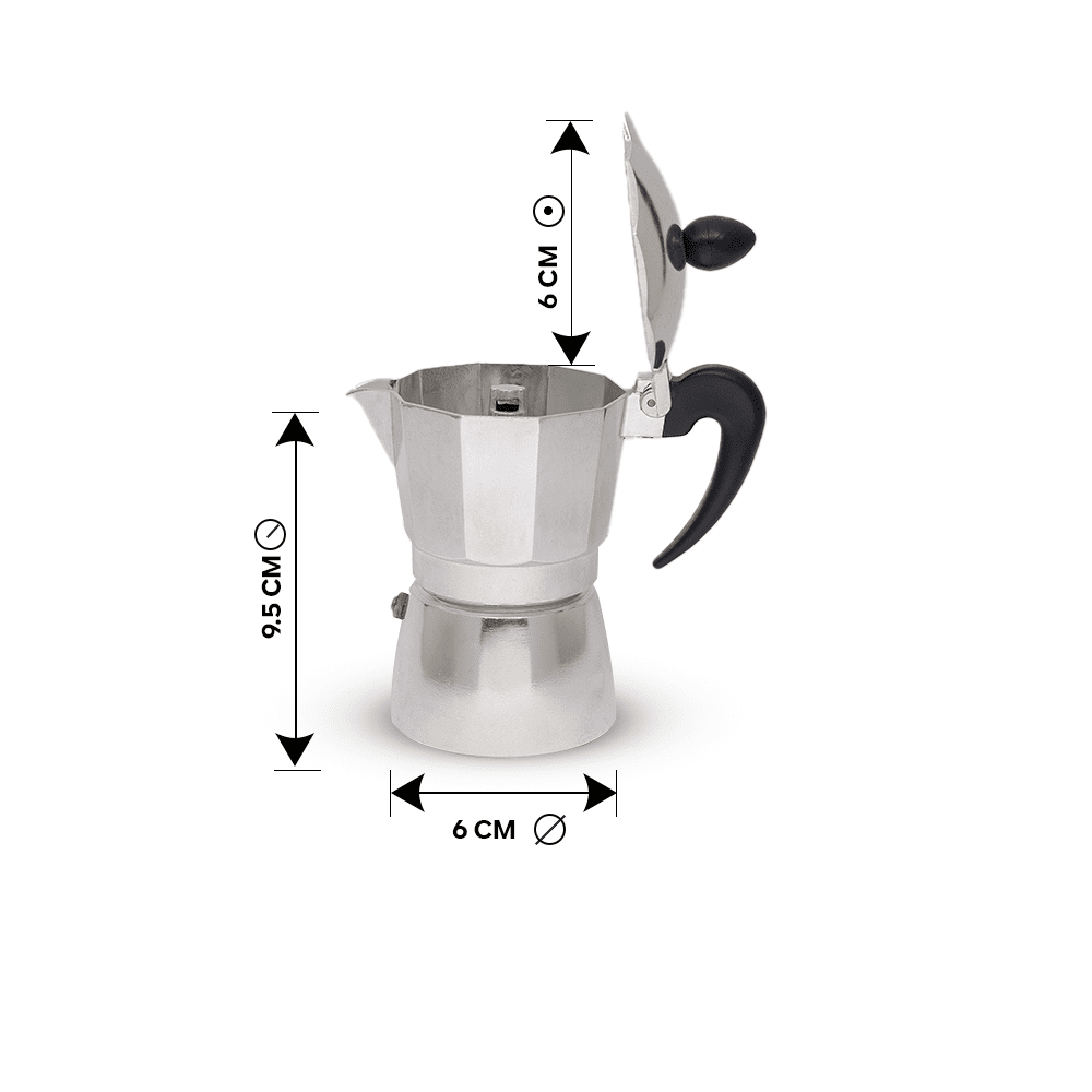 ماكينة قهوة كلاسيكية مصنوعة من الألومنيوم المقاوم للصدأ، تتكون من ثلاثة أجزاء: القاعدة التي تحتوي على الماء، الحجرة الوسطى لحبوب القهوة، والجزء العلوي حيث يُحضَّر القهوة.