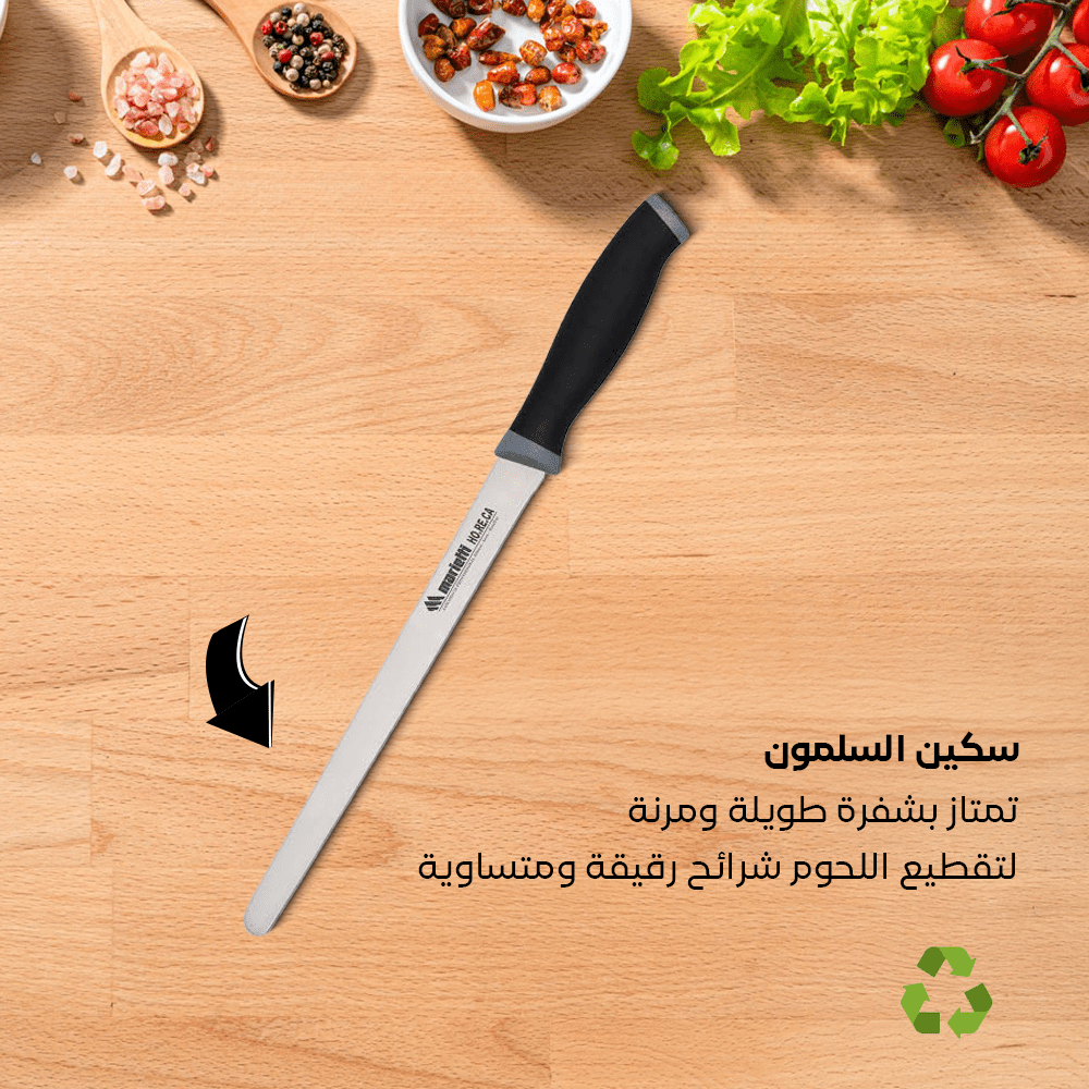 - تتميز بشفرة طويلة، مسطحة وحادة لتقطيع السلمون والأسماك بدقة متناهية.