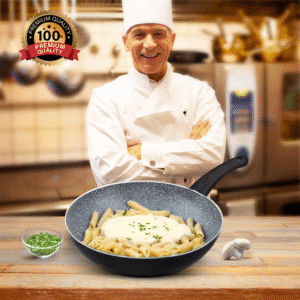 It is nickel and PFOA free, made from heat resistant materials, Also It features an excellent ceramic base for even heat distribution throughout the pan, ensuring the highest quality and even cooking, Dishwasher safe And It Is Italian-made.