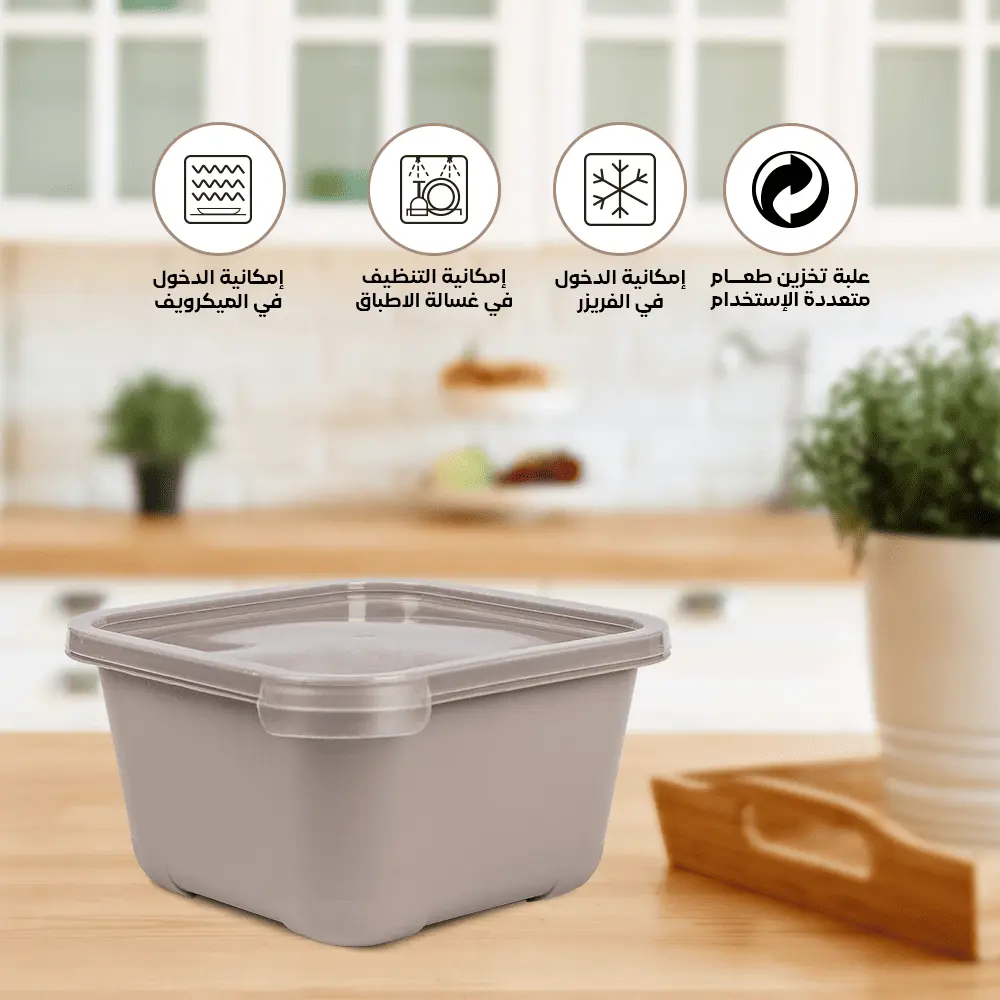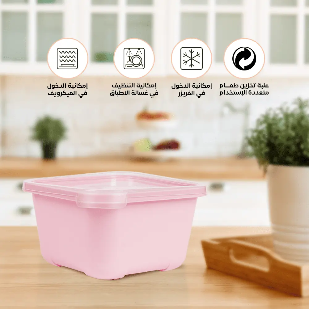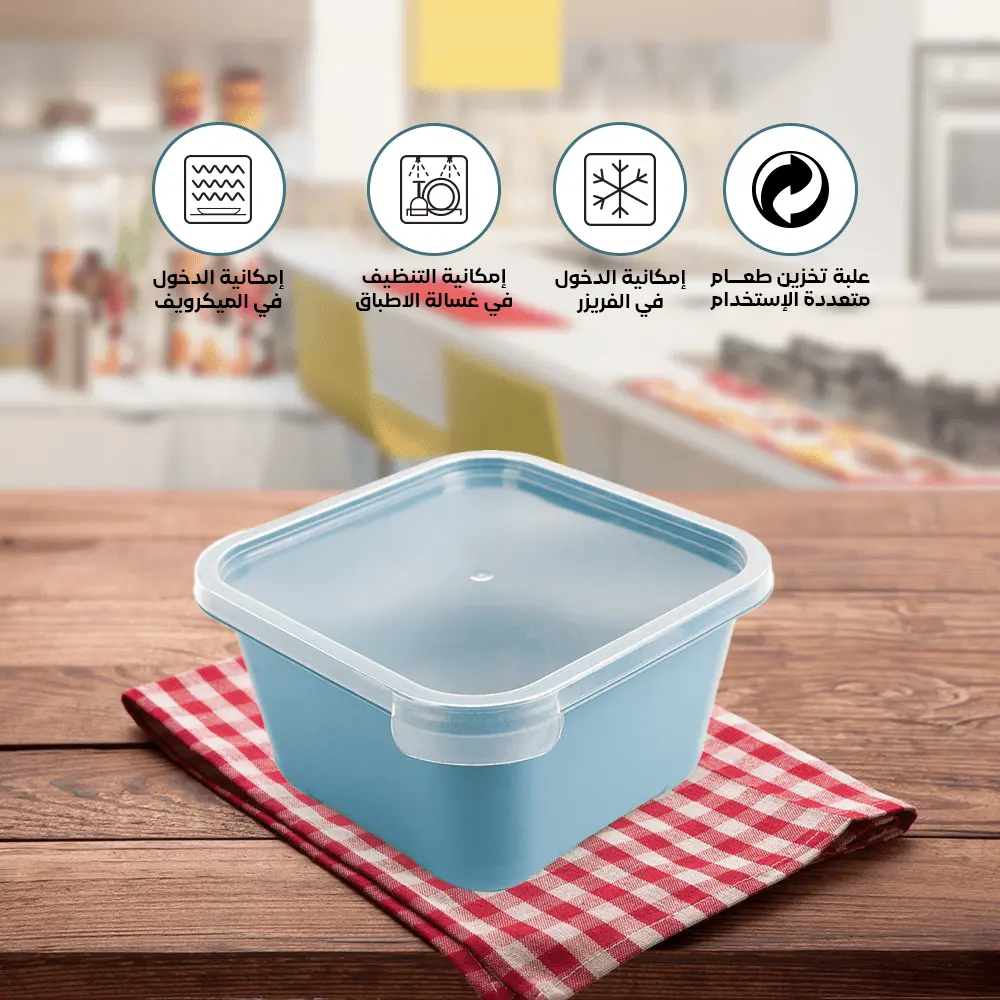 plastic storage containers for food with lids from Spain with a capacity of (1.30 liters) in different colors to suit all tastes. This set is characterized by being square in shape, which makes the refrigerator better arranged. One of the features of this set is that it is durable and lightweight, which makes it easy to use on a daily basis anywhere.