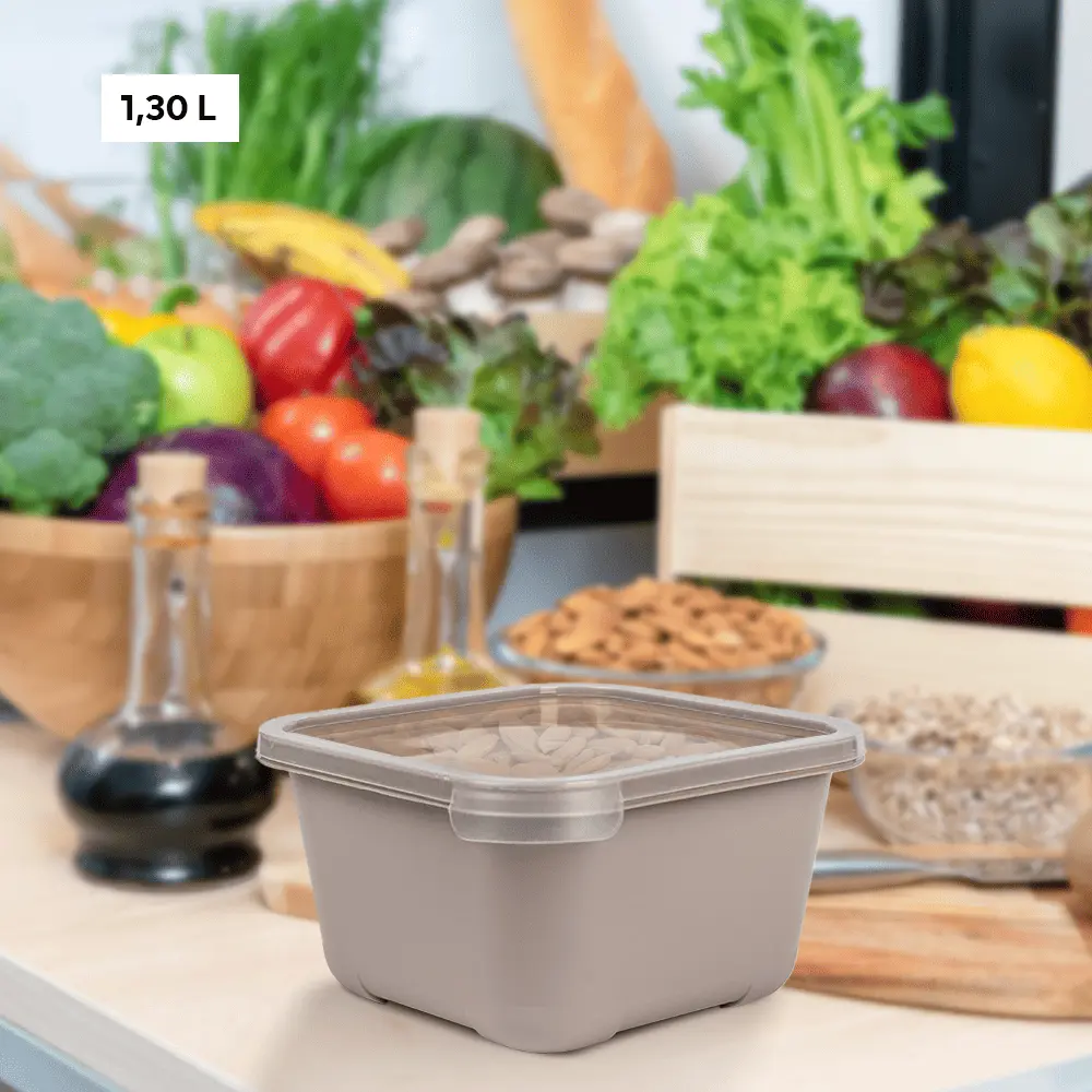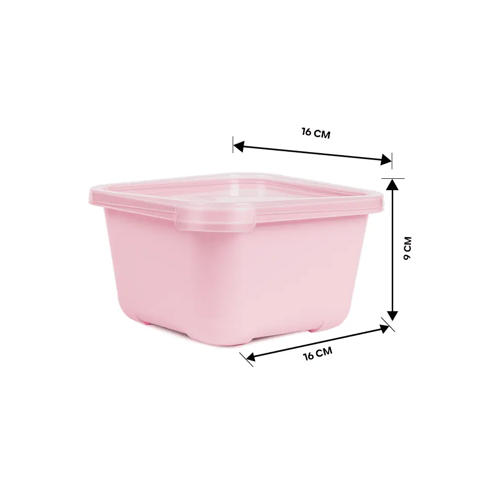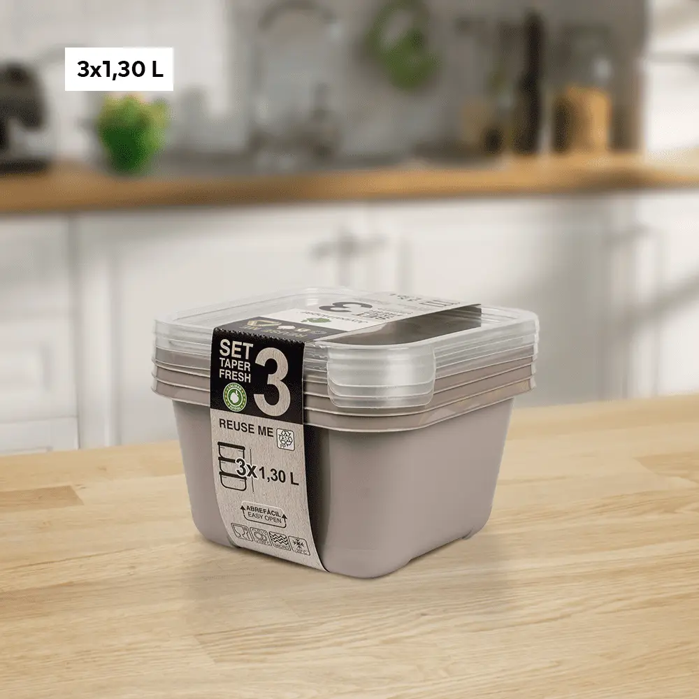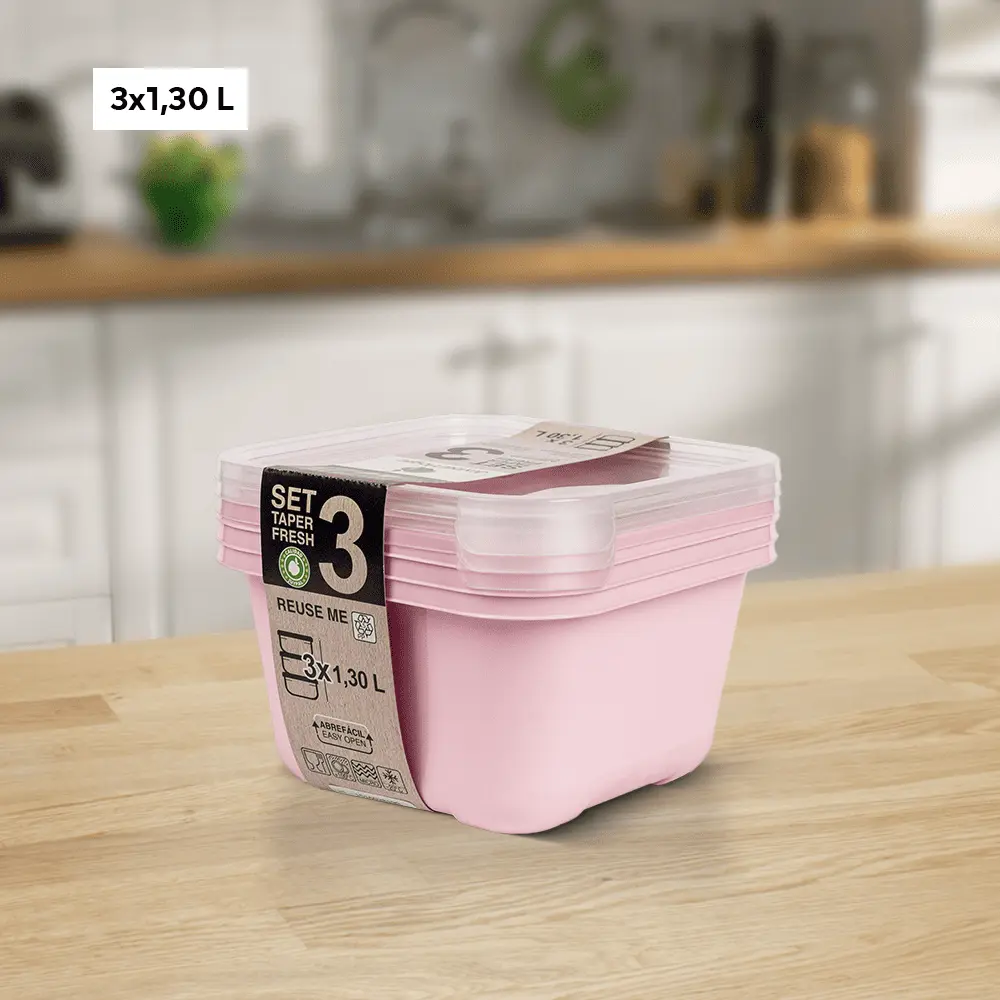 plastic storage containers for food with lids from Spain with a capacity of (1.30 liters) in different colors to suit all tastes. This set is characterized by being square in shape, which makes the refrigerator better arranged. One of the features of this set is that it is durable and lightweight, which makes it easy to use on a daily basis anywhere.